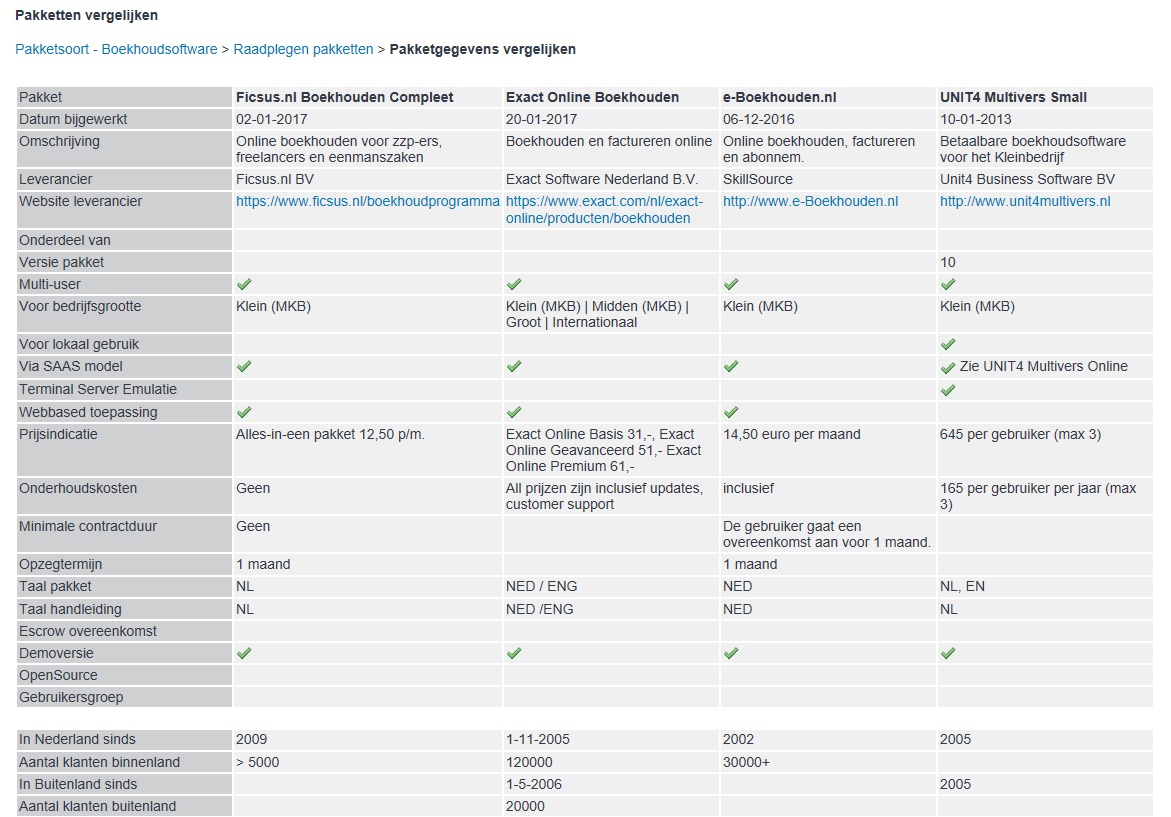 Gezegd moet worden dat het een welkome aanvulling zou zijn op de staatjes die GBNED produceert. Als fabrikant van een softwarepakket kun je voor € 1500 jouw pakket op de site van GBNED laten opnemen. Het idee is dat potentiële klanten daar kunnen vergelijken welk pakket het beste bij ze past.