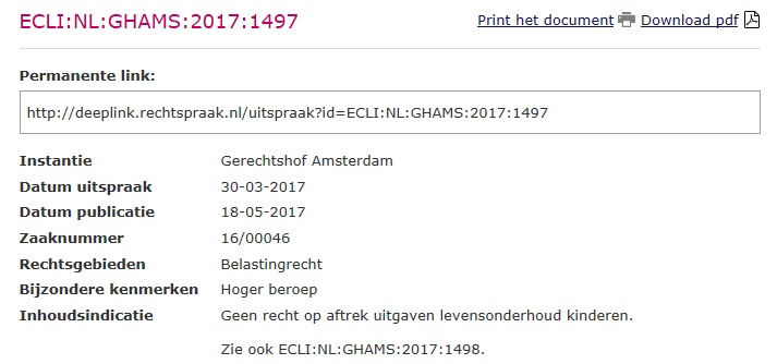 De Belastingdienst was het niet eens met de aftrekpost, en kreeg gelijk van de rechter en van de hogere rechter. Veel belangrijker dan dat de Kinderbijslag was uitbetaald op een bankrekening van de vader bleek te zijn dat de moeder degene was die de Kinderbijslag had aangevraagd. Zij had gewoon alles georchestreerd. Omdat daarmee was aangetoond dat zij recht had op Kinderbijslag, had ze geen recht op de aftrekpost.